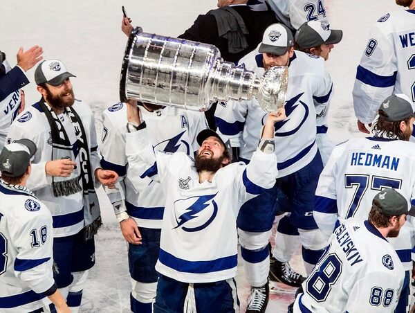 FILE - In this Sept. 28, 2020, file photo, Tampa Bay Lightning's Nikita Kucherov (86) hoists the Stanley Cup after defeating the Dallas Stars in the NHL Stanley Cup hockey finals in Edmonton.The Canadian Press
