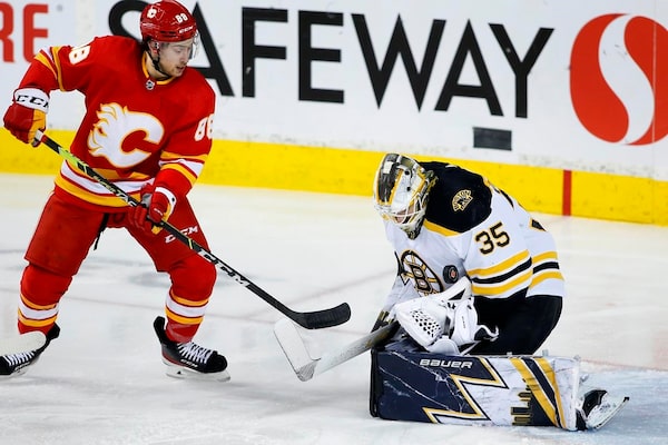 Boston Bruins goalie Linus Ullmark makes a save against Calgary Flames' Andrew Mangiapane during second period NHL hockey action in Calgary, on Dec. 11.The Canadian Press