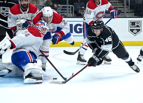 Montreal Canadiens goaltender Jake Allen (34) blocks a shot by Los Angeles Kings center Blake Lizotte (46) in the second period of the game at Staples Center in L.A.Jayne Kamin-Oncea/USA TODAY Sports via Reuters