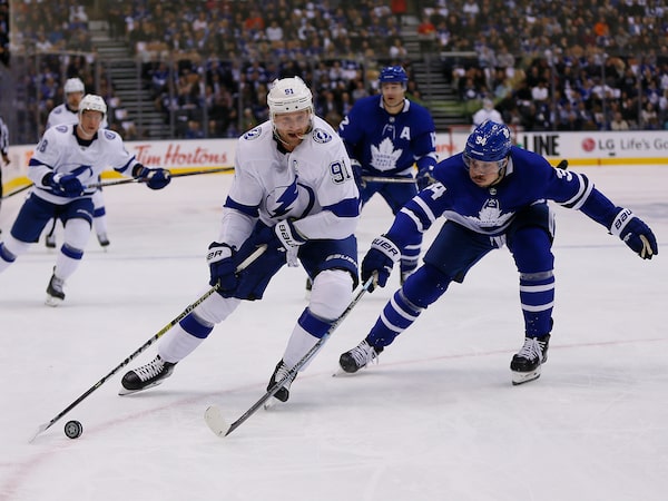 Tampa Bay Lightning forward Steven Stamkos works the puck around Auston Matthews of the Maple Leafs during a game at Scotiabank Arena in Toronto on April 4, 2019.John E. Sokolowski/USA TODAY Sports via Reuters
