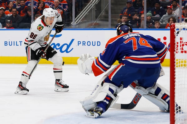 Chicago Blackhawks forward Connor Bedard tries to get a shot away on Edmonton Oilers goaltender Stuart Skinner during the second period at Rogers Place. The Oilers won 4-1 on Dec. 12, 2023.Perry Nelson/Reuters