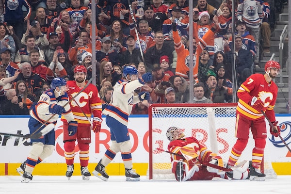 Calgary Flames goalie Dustin Wolf (32), Kevin Bahl (7) and Rasmus Andersson (4) react as Edmonton Oilers' forward Zach Hyman (18) and Connor McDavid (97) celebrate a goal during the third period of their game in Edmonton on Tuesday.AMBER BRACKEN/The Canadian Press
