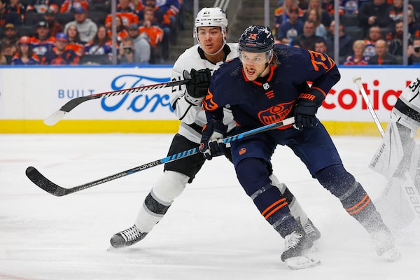 Edmonton Oilers defensemen Vincent Desharnais and Los Angeles Kings defencemen Jordan Spence battle for position during the first period at Rogers Place. The Oilers won 4-1 on March 28, 2024.Perry Nelson/Reuters