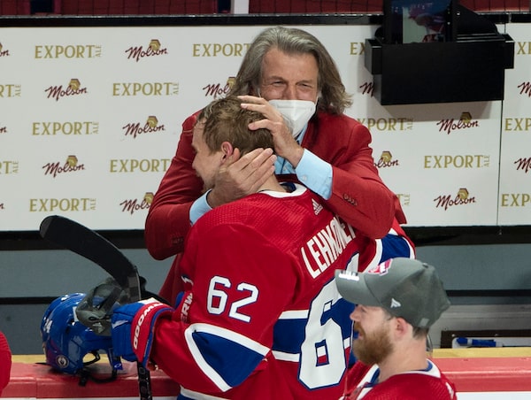 Montreal Canadiens left wing Artturi Lehkonen gets a hug from general manager Marc Bergevin after scoring the winning goal to defeat the Vegas Golden Knights on June 24, 2021 in Montreal.Ryan Remiorz/The Canadian Press