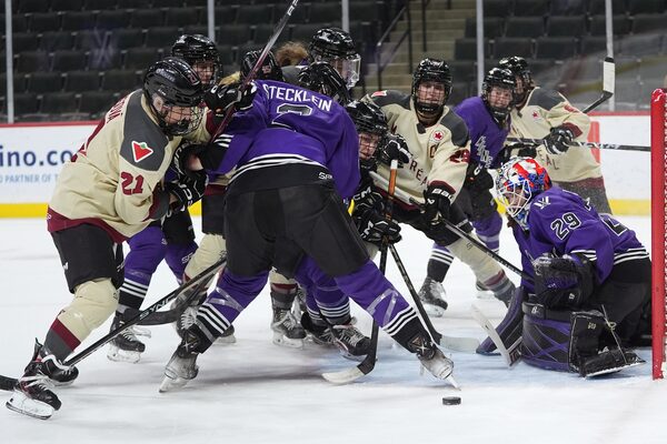 Minnesota and Montreal players battle for the puck during the second period. PWHL Montreal won 2-1 on Jan. 24, 2024, in St. Paul, Minn.Abbie Parr/The Associated Press
