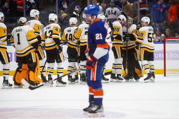 Pittsburgh Penguins players celebrates after defeating the New York Islanders on Nov. 26, 2021, in Elmont, N.Y.The Canadian Press