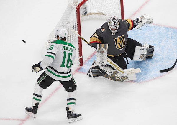 Dallas Stars' Joe Pavelski (16) is stopped by Vegas Golden Knights goalie Robin Lehner (90) during third period NHL Western Conference final playoff action in Edmonton on Sept. 8, 2020.JASON FRANSON/The Canadian Press