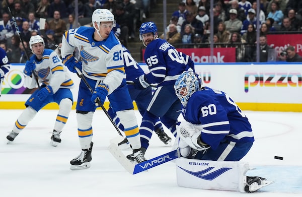 Joseph Woll makes a save as St. Louis Blues' Dylan Holloway looks on during third period action on Tuesday.Nathan Denette/The Canadian Press