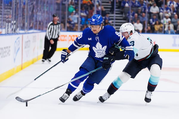 Toronto Maple Leafs' William Nylander, left, and Seattle Kraken's Will Borgen battle for the puck in Toronto on Oct. 31.Cole Burston/The Canadian Press