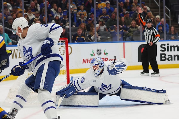 Ilya Samsonov of the Toronto Maple Leafs makes a save against the St. Louis Blues in the first period at Enterprise Center. The Maple Leafs won 5-4 in overtime on Dec. 27, 2022, in St. Louis.Dilip Vishwanat/Getty Images