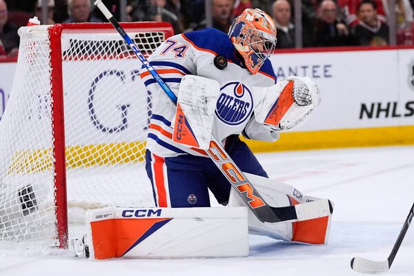 Edmonton Oilers goaltender Stuart Skinner blocks a shot during the second period against the Chicago Blackhawks. The Oilers won 2-1 on Jan. 9, 2024, in Chicago.Erin Hooley/The Associated Press
