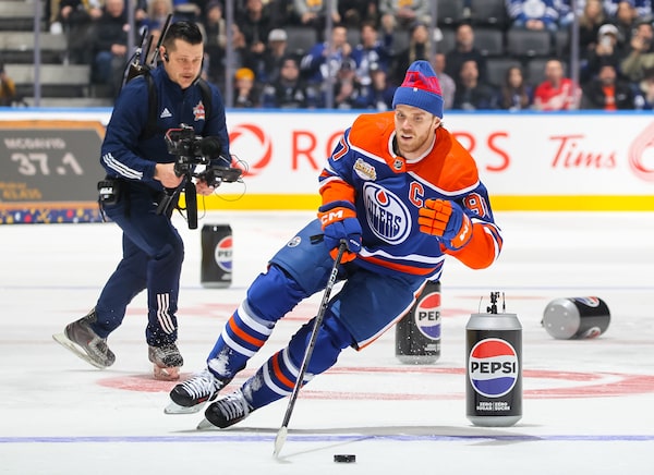 Connor McDavid of the Edmonton Oilers competes in the Pepsi NHL Obstacle Course during 2024 NHL All-Star Skills Competition at Scotiabank Arena on Feb. 2, 2024 in Toronto.Claus Andersen/Getty Images