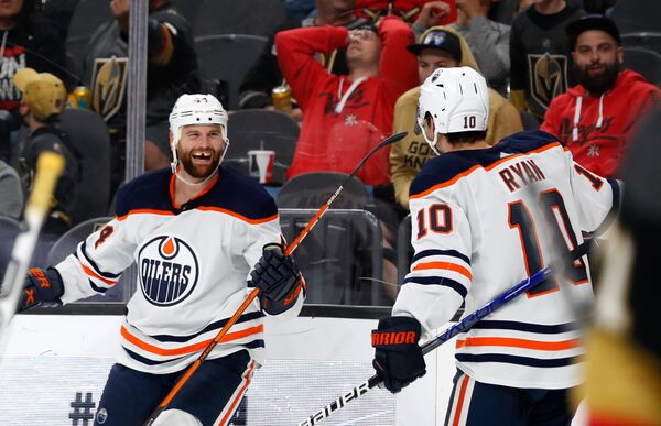 Edmonton Oilers right wing Zack Kassian, left, celebrates with centre Derek Ryan after scoring during the third period against the Vegas Golden Knights on Oct. 22, 2021. The Oilers beat the Knights 5-3.Steve Marcus/The Associated Press