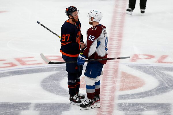 Connor McDavid #97 of the Edmonton Oilers shakes hands with Gabriel Landeskog #92 of the Colorado Avalanche after Colorado defeated Edmonton 6-5 in overtime in Game Four of the Western Conference Final of the 2022 Stanley Cup Playoffs, on June 6.Codie McLachlan/Getty Images