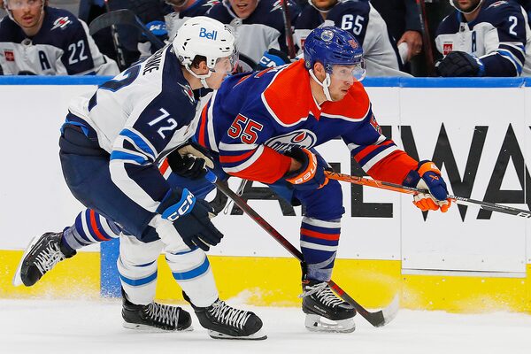 Edmonton Oilers forward Dylan Holloway and Winnipeg Jets defencemen Leon Gawanke during a game at Rogers Place, in Edmonton, on Sept. 25.Perry Nelson/USA TODAY Sports via Reuters