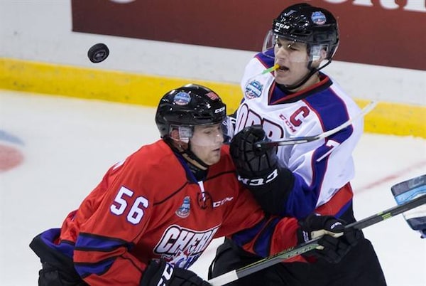 Team Cherry's Markus Niemelainen, left, of Finland, checks Team Orr's Matthew Tkachuk during second period CHL/NHL Top Prospects Game hockey action in Vancouver, B.C., on Jan. 28, 2016.The Canadian Press