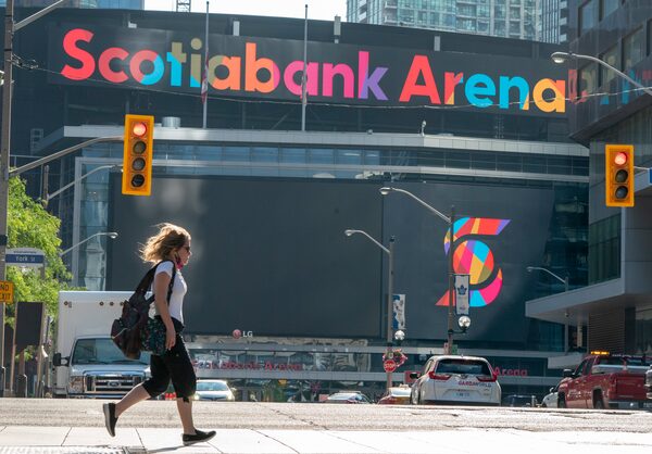 A woman crosses the road in front of Scotiabank Arena in Toronto on July 2, 2020.Frank Gunn/The Canadian Press