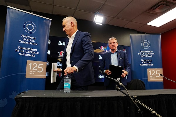 President and CEO of the Ottawa Senators Cyril Leeder (right) and Chief Executive Officer of the National Capital Commission Tobi Nussbaum leave a news conference, Sept. 20, in Ottawa. The Senators and the National Capital Commission have reached an agreement in principle to build a new arena in downtown Ottawa.Adrian Wyld/The Canadian Press