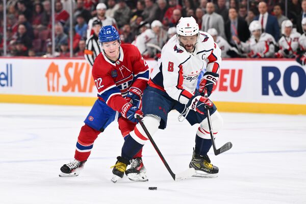 Cole Caufield #22 of the Montreal Canadiens and Alex Ovechkin #8 of the Washington Capitals skate after the puck during the first period at the Bell Centre on February 17, 2024 in MontrealMinas Panagiotakis/Getty Images