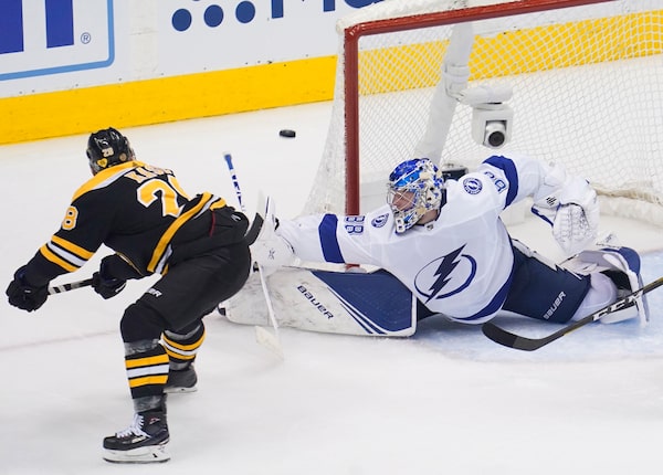 Boston Bruins right wing Ondrej Kase (28) shoots wide of Tampa Bay Lightning goaltender Andrei Vasilevskiy (88) during the third period in game four of the second round of the 2020 Stanley Cup Playoffs at Scotiabank Arena.John E. Sokolowski/USA TODAY Sports via Reuters