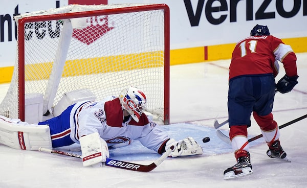 Florida Panthers left wing Jonathan Huberdeau scores a goal past Montreal Canadiens goaltender Jake Allen during the third period. The Panthers won 7-4 on March 29, 2022, in Sunrise, Fla.Jim Rassol/The Associated Press