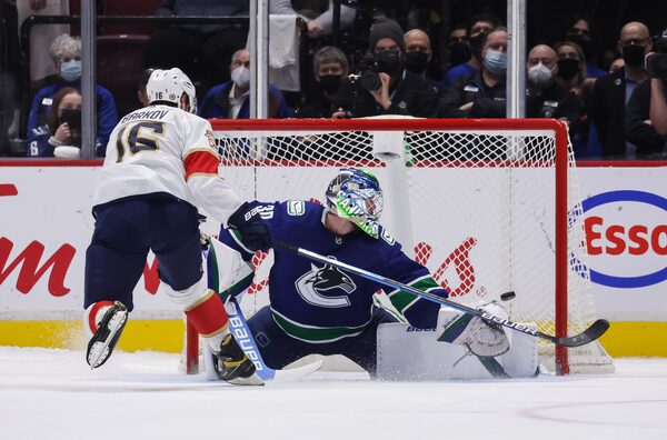Florida Panthers' Aleksander Barkov, left, of Finland, scores the winning goal against Vancouver Canucks goalie Spencer Martin during shootout NHL hockey action in Vancouver, on Friday, January 21, 2022.DARRYL DYCK/The Canadian Press