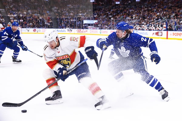 Florida Panthers forward Mackie Samoskevich, left, protects the puck from Maple Leafs defenceman Simon Benoit in Toronto on Saturday.Cole Burston/The Canadian Press