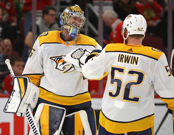 Goaltender Pekka Rinne of the Nashville Predators gets congratulations from Matt Irwin after scoring his first career goal, an empty net shot on Thursday.Jonathan Daniel/Getty Images