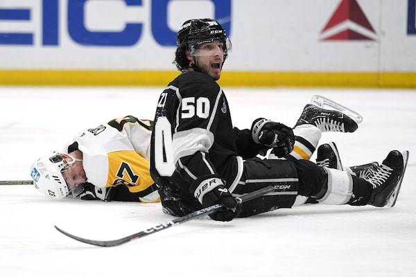 Pittsburgh Penguins center Sidney Crosby, left, lays on the ice after getting cross checked by Los Angeles Kings defenseman Mikey Anderson as defenseman Sean Durzi, right looks on during the third period of an NHL hockey game on Feb. 11. in Los Angeles.The Associated Press