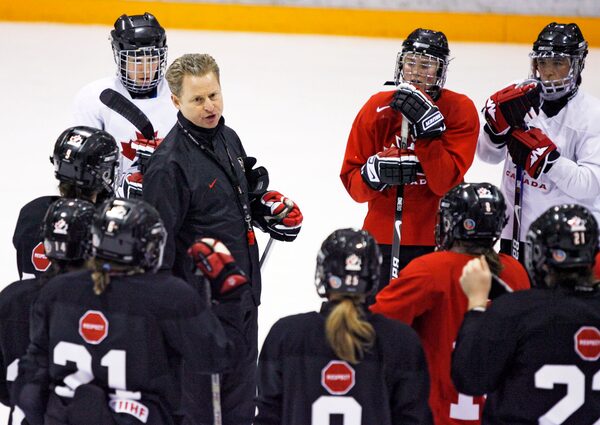 Peter Smith, left centre, who was head coach in 2008 when Canada claimed silver at the world championship, is seen speaking with players during opening day of Canadian women's hockey team camp in Calgary on Jan. 21, 2008. Smith has stepped down as head coach of McGill’s women’s hockey team.Jeff McIntosh/The Canadian Press
