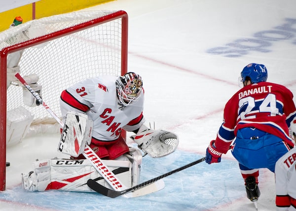 Montreal Canadiens centre Phillip Danault (24) scores on Carolina Hurricanes goaltender Anton Forsberg (31) during first period NHL hockey action in Montreal, Saturday, Feb. 29, 2020.Peter Mccabe/The Canadian Press