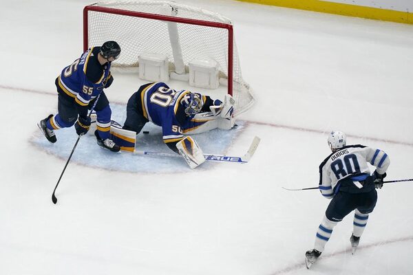 Winnipeg Jets' Pierre-Luc Dubois (80) scores the game-winning goal past St. Louis Blues' Colton Parayko (55) and goaltender Jordan Binnington (50) during overtime of an NHL hockey game Sunday, March 13, 2022, in St. Louis.The Associated Press