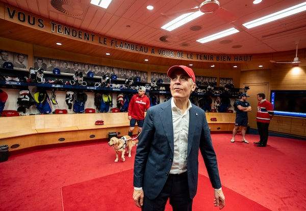 Prime Minister Mark Carney looks around the Montreal Canadiens' dressing room after their win over the Tampa Bay Lightning in Montreal on Thursday.Christinne Muschi/The Canadian Press