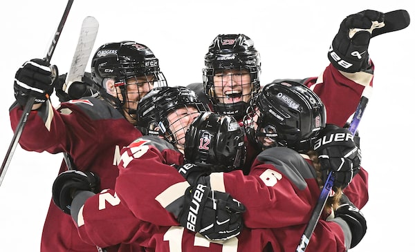 PWHL Montreal's Leah Lum, front, celebrates with teammates after scoring against New York during the first period in Laval, Que. Montreal won 3-2 on Jan. 16, 2024.Graham Hughes/The Canadian Press