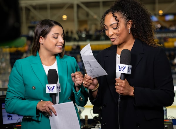 Commentator Daniella Ponticelli and colour analyst Saroya Tinker watch their broadcast segment while waiting for May 5's PWHL game to start at Toronto's Mattamy Athletic Centre.Melissa Tait/The Globe and Mail