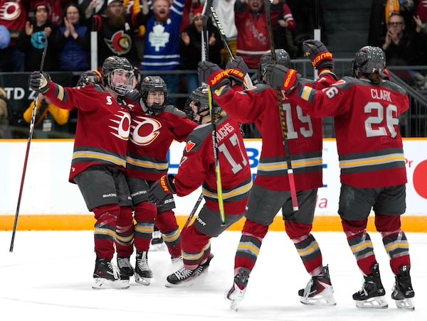 Rebecca Leslie (37) of the Ottawa Charge celebrates her second goal of the game against the Seattle Torrent during a game in Ottawa earlier this season.Justin Tang/The Canadian Press