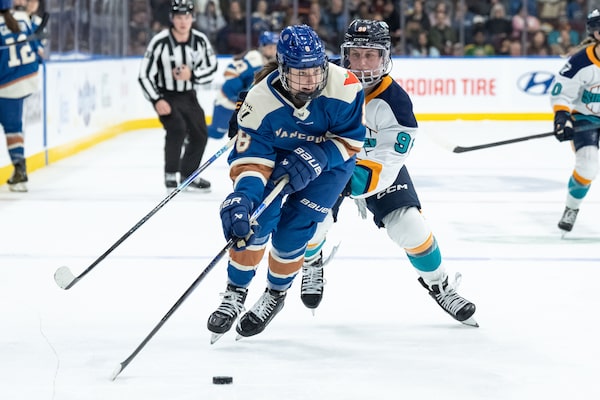 Vancouver Goldeneye Izzy Daniel (8) and New York Siren Kristyna Kaltounkova (98) vie for the puck during a game in Vancouver earlier this month.ETHAN CAIRNS/The Canadian Press