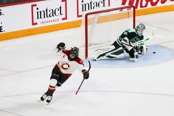 Marie-Philip Poulin (left) celebrates with teammates Laura Stacey and Maggie Flaherty after a goal against the Minnesota Frost earlier this month at Place Bell in Laval.Graham Hughes/The Canadian Press