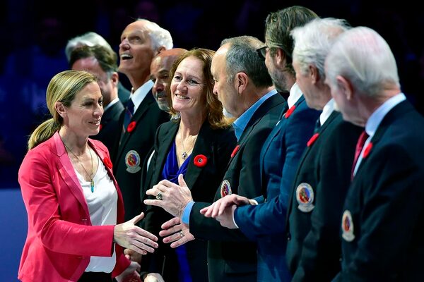 Hockey Hall of Fame inductee Jayna Hefford shakes hands with people associated with the hall, before a hockey game between the Toronto Maple Leafs and the New Jersey Devils in Toronto on Nov. 9, 2018.The Canadian Press
