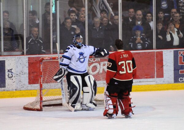 Quebec Remparts' goalie Jonathan Roy, right, challenges Chicoutimi Sagueneens' goalie Bobby Nadeau to a fight during a game in Chicoutimi, Que., on March 22, 2008.Jeannot Levesque/The Canadian Press