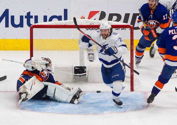 Tampa Bay Lightning's Brayden Point celebrates his goal on New York Islanders goalie Semyon Varlamov during third period NHL Eastern Conference final playoff action in Edmonton on Sunday, Sept. 13, 2020.JASON FRANSON/The Canadian Press