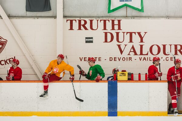 Royal Military College Paladins practice ahead of their game against rival team Black Knights, on Jan. 30. The RMC's logo of 'Truth, Duty, Valour' is painted on the walls of the Kingston Constantine Arena in Kingston, Ont.Kaja Tirrul/The Globe and Mail