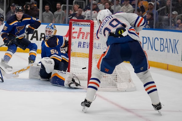 Edmonton Oilers' Leon Draisaitl scores past St. Louis Blues goaltender Jordan Binnington during the third period. The Blues won 3-2 on April 1, 2024, in St. Louis.Jeff Roberson/The Associated Press