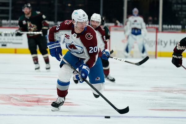 Colorado Avalanche left wing Brandon Saad skates against the Arizona Coyotes in Glendale, Ariz., on March 23, 2021. The St. Louis Blues signed Brandon Saad to a five-year contract on July 29, 2021.Rick Scuteri/The Associated Press