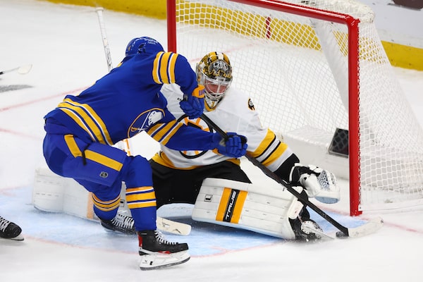 Buffalo Sabres defenceman Bowen Byram (4) is stopped by Boston Bruins goaltender Jeremy Swayman (1) during Game 2 of their first-round playoff series on Tuesday in Buffalo, N.Y.Jeffrey T. Barnes/The Associated Press