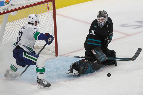 The Sharks were protecting a 1-0 lead early in the third when Dell came up with several big saves following defensive breakdowns, robbing J.T. Miller, Tanner Pearson and Brock Boeser early in the period. He made another stop of Boeser to fuel a rush the other way.