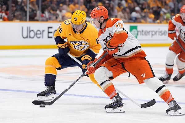 Anaheim Ducks right wing Troy Terry (19) skates the puck past Nashville Predators left wing Zachary L'heureux (68).George Walker IV/The Associated Press