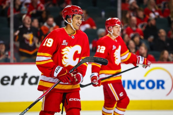 Calgary Flames defenseman Zayne Parekh (19) celebrates his goal against the Los Angeles Kings.Sergei Belski/Reuters
