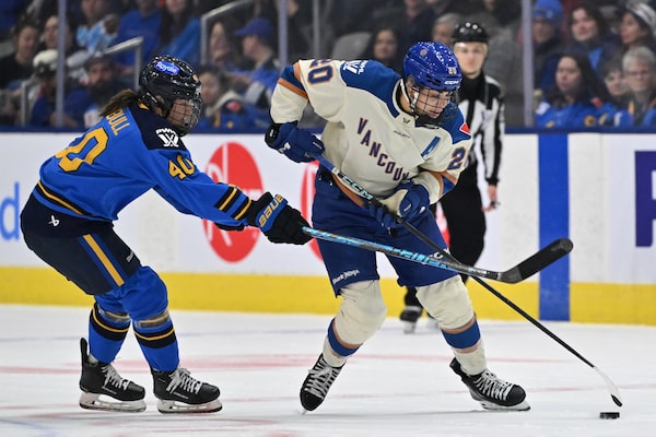 Vancouver Goldeneye forward Sarah Nurse (20) moves the puck past Toronto Sceptres forward Blayre Turnbull (40) during their game in Toronto on Sunday.Jon Blacker/The Canadian Press