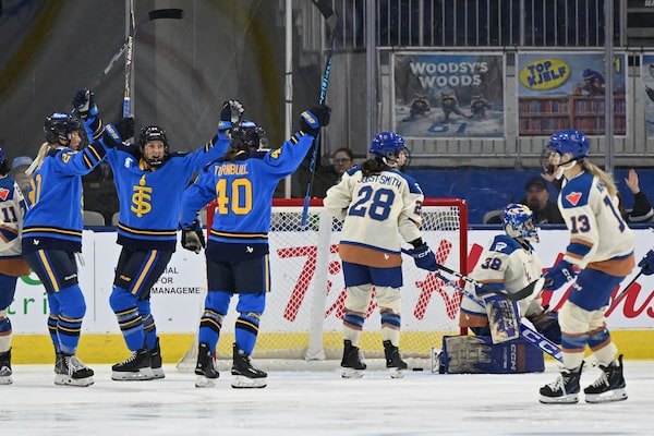 Toronto Sceptres players celebrate Blayre Turnbull's (40) goal against the Vancouver Goldeneyes during first period play on Sunday.Jon Blacker/The Canadian Press